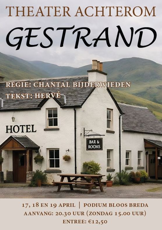 Op vrijdag 17, zaterdag 18 en en zondag19 april 2026 speelt Achterom de gloednieuwe productie 'Gestrand' in Podium Bloos, Breda. !! NB: het nieuwe (tijdelijke) adres van Podium Bloos is: Crogtdijk nummer 54 !!